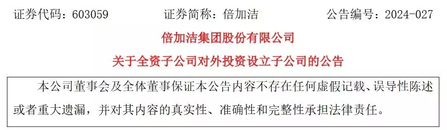 倍加洁(603059)于5月10日发布公告称,倍加洁集团股份有限公司(以下简称“公司”)全资子公司扬州倍加洁日化有限公司(以下简称“倍加洁日化”)在杭州设立子公司杭州益亲电子商务有限公司(以下简称“杭州益亲”)。      基于公司的战略规划和业务发展需要,公司全资子公司倍加洁日化在杭州设立子公司杭州益亲,本次投资一方面可以借助当地电商资源,进一步拓展电商销售渠道,及时把握商业机遇,夯实公司主营业务,另一方面,通过在电商渠道实现品牌创新展示,有助于提升公司品牌的知名度和市场竞争力,从而提升公司综合竞争力。      近日,倍加洁日化已在杭州完成杭州益亲的注册登记手续,并取得当地市场监督管理局颁发的营业执照,具体注册信息如下:      公司名称:杭州益亲电子商务有限公司。      注册资本:600 万元。      出资方式及股权结构:公司全资子公司倍加洁日化以自有资金认缴出资 600 万元,持有 100%股权。      注册地址:杭州市余杭区。      经营范围:一般项目:互联网销售(除销售需要许可的商品);个人卫生用品销售;日用杂品销售;化妆品批发;化妆品零售;卫生用品和一次性使用医疗用品销售;日用百货销售;针纺织品销售;劳动保护用品销售;纸制品销售;办公用品销售;日用化学产品销售;消毒剂销售(不含危险化学品);塑料制品销售(除依法须经批准的项目外,凭营业执照依法自主开展经营活动)。